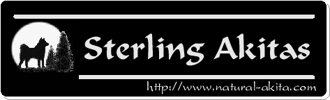 Introduction to Sterling Akitas Thanks for visiting Sterling Akitas. Though we don't breed very often, we strive with each breeding to produce pups that are a reflection in looks and temperament of what Akitas are all about. If you are interested in a nice adult female, please visit Foxfire's page. She deserves a family of her own! The dogs on our site cannot demonstrate their temperaments. Jenji can't "woo" at you; Gem can't show you her version of a happy face. T can't give you Akita love nibbles nor can Abby give you a slurp, but you can see what a good-looking gang they are! You may have already gleaned that our approach to raising Akitas is a bit off the beaten track than most others. We believe strongly that optimal nutrition is the foundation and the key to health. Thus, we feed our dogs a raw meat diet and wean our puppies onto that diet. We expect our buyers to do the same. Take a minute to read the overview of our philosophy to get a better idea of what our stance entails. If you have questions, feel free to email me at [email protected]. For more information on the raw canine diet, visit the Natural Canine section of the site. You are also welcome to join the Natural Akita email list to discover from other Akita owners the difference feeding a raw diet has made in the lives of their Akitas. |